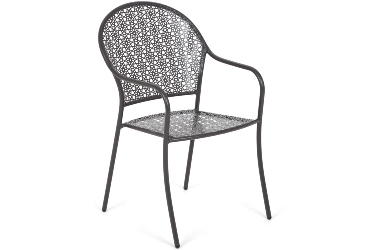 Atrakcyjne i przykuwające wzrok krzesła maja są wykonane z profili metalowych. Natomiast siedziska i oparcia krzeseł wycięte w ażurowe wzory. Metal jest pomalowany półmatową farbą proszkową, co zapewnia ciekawy design, ale także zabezpiecza je przed rdzewieniem. Krzesła są zabezpieczone końcówkami z tworzywa sztucznego. Krzesła Maja będą wdzięcznym elementem aranżacji tarasu, a także wnętrza np. cukierni czy lodziarni.