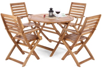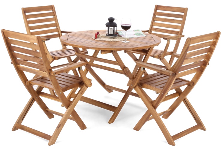 Drewniane meble ogrodowe Akacja Round Cross to komplet mebli dla 4 osób składający się z okrągłego stołu i 4 krzeseł. Wykonane są z drewna akacjowego - niezwykle twardego i odpornego na różnorakie warunki pogodowe: odpowiednio zabezpieczane mogą posłużyć długie, długie lata. Nieskomplikowany design wzbogacają skrzyżowane nogi poszczególnych elementów, dodatkowo wyprofilowane w kształt delikatnych łuków. Blat stołu o średnicy 100 cm na środku posiada otwór na parasol ogrodowy. Krzesła są bardzo wygodne, wyposażone w podłokietniki. Zarówno stół, jak i krzesła są składane - łatwo je więc przechowywać poza sezonem.