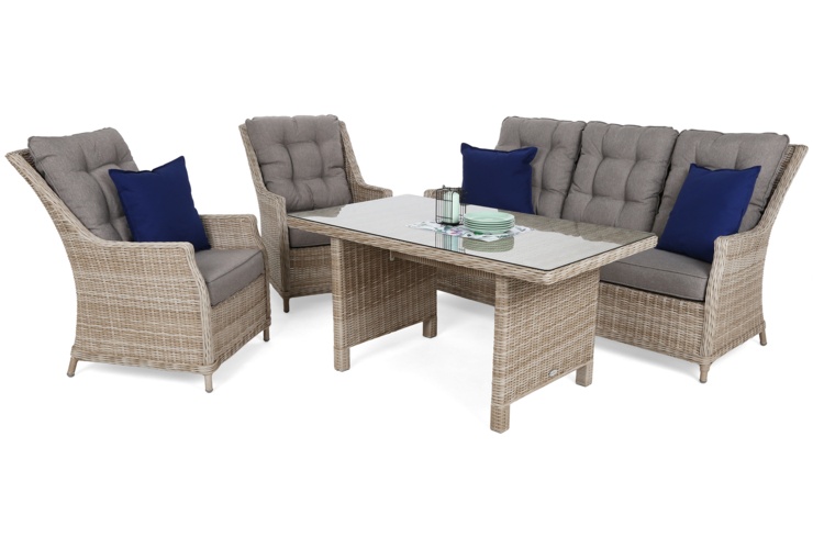 Meble ogrodowe Alicante, to nowoczesny zestaw wypoczynkowy, który z łatwością pomieści 5-6 osób. Doskonały do organizowania letnich spotkań, zarówno na świeżym powietrzu jak i w domu. Wysoki profil oparcia kompletu pozwala na większy komfort siedzenia nawet dla wysokich osób. Zestaw składa się z sofy, 2 foteli oraz stołu z hartowaną szybą. Konstrukcja aluminiowa została pokryta ręcznie wyplatanym technorattanem, o fakturze wikliny, dzięki czemu mebel wygląda bardzo naturalnie i estetycznie. Wysokie oparcia foteli oraz sofy, zapewniają wysoki komfort podczas siedzenia. Poduszki wykonane są z poliestru, co czyni je odpornymi na niekorzystne warunki atmosferyczne oraz chroni przed działaniem wody. Łatwo je ściągnąć i poddać zabiegowi czyszczenia. Zestaw Alicante to propozycja dla osób o wysublimowanym guście, którzy cenią sobie, jakość i wygodę.