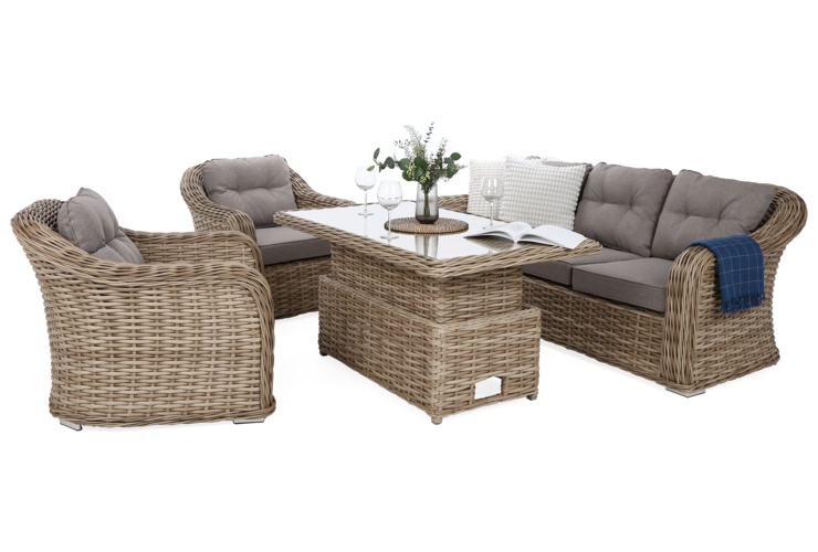 Stwórz strefę relaksu, która łączy luksusowy design z niezwykłą praktycznością. Zestaw mebli technorattanowych Foggia Flex to idealna propozycja dla osób, które nie chcą wybierać między wygodnym zestawem kawowym a funkcjonalnym kompletem obiadowym. Dzięki unikalnej konstrukcji stołu, Twoje ogrodowe centrum dowodzenia dostosuje się do każdej okazji.