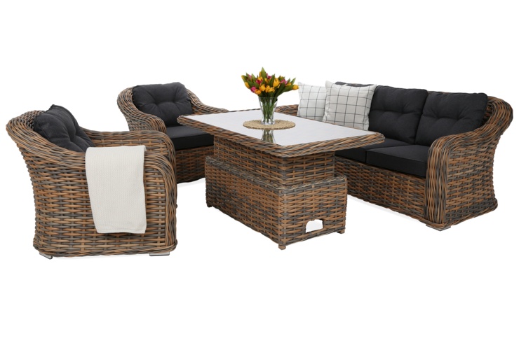 Stwórz strefę relaksu, która łączy luksusowy design z niezwykłą praktycznością. Zestaw mebli technorattanowych Foggia Flex to idealna propozycja dla osób, które nie chcą wybierać między wygodnym zestawem kawowym a funkcjonalnym kompletem obiadowym. Dzięki unikalnej konstrukcji stołu, Twoje ogrodowe centrum dowodzenia dostosuje się do każdej okazji.