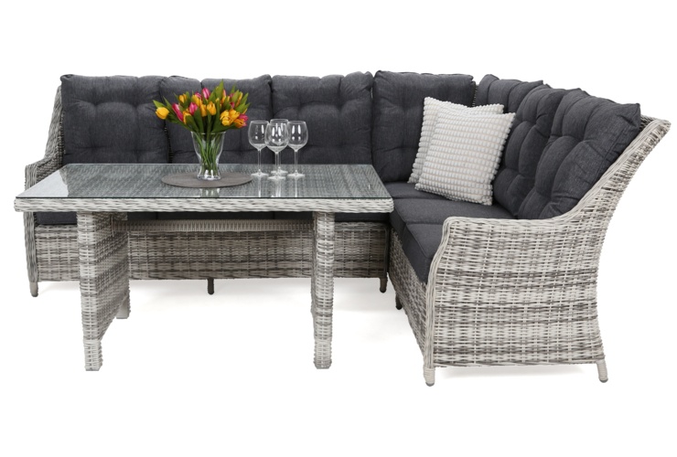 Stwórz wygodną przestrzeń do relaksu na zewnątrz dla całej rodziny. Wybierz narożnik przeznaczony dla 6 osób. Mebel wypełniony poduchami zapewni komfort podczas przyjemnych niedzielnych poranków z najbliższymi. Model został wykonany z materiałów, którym niestraszne deszcz czy promienie słoneczne. To gwarancja, że będzie spełniał swoją funkcję i estetycznie wyglądał przez wiele sezonów. W zestawie z narożnikiem znajdziesz stół o optymalnym rozmiarze.