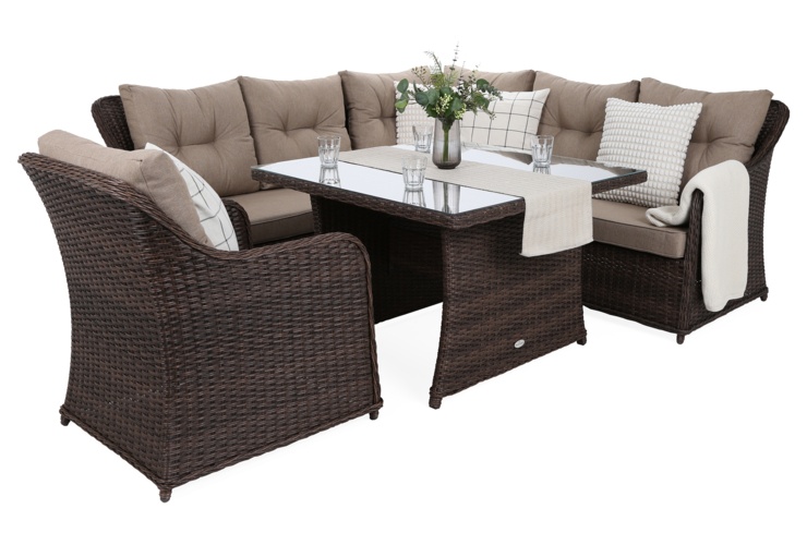 Narożny zestaw mebli ogrodowych brązowy Bergamo to doskonała propozycja dla osób, które cenią sobie połączenie elegancji z funkcjonalnością. Idealnie pasujący do ogrodu, na taras, czy balkon, komplet stworzy przytulny kącik wypoczynkowy, gdzie będziesz mógł cieszyć się relaksem na świeżym powietrzu. Narożnik, stół oraz fotel prezentują się wyjątkowo elegancko, dodając każdej przestrzeni zewnętrznej stylu i klasy.