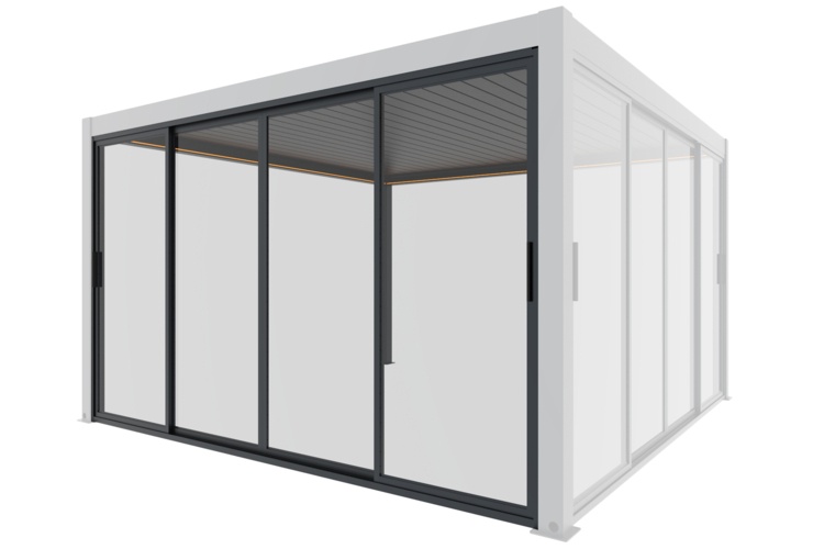 Szklane wypełnienie pozwala na regulację cyrkulacji powietrza, zapewniając przyjemny mikroklimat pod pergolą. Szerokość i ilość paneli zostały zaprojektowane specjalnie z myślą o pergoli Schatler Nova Lux Alu.