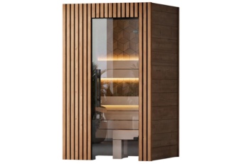 Como wyróżnia się ścianami wykonanymi z drewna thermowood o grubości 40 mm. Front sauny zaprojektowano z pionowych lameli, które nadają całości czysty i nowoczesny charakter. Sufit jes odpowiednio izolowany i wykończony 15-milimetrowym drewnem termicznym STS, co zapewnia optymalne utrzymanie ciepła. Przezroczyste drzwi z hartowanego szkła podkreślają minimalistyczny design. Dzięki regulowanym stópkom łatwo wypoziomyjesz saunę również na nierównych powierzchniach.