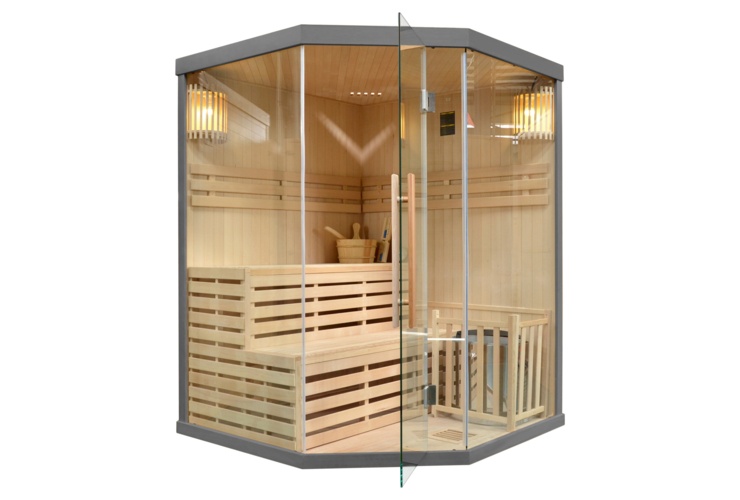 | Wyposażenie | oświetlenie wewnętrzne z osobną wtyczką zasilania; piec i kamienie; ceber z chochlą na wodę do zraszania kamieni; higrometr (pomiar wilgotności); klepsydra (do odmierzania czasu seansu w saunie); dodatkowe oświetlenie LED RGB |