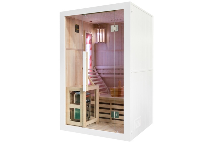 | Wyposażenie | • oświetlenie wewnętrzne z osobną wtyczką zasilania • piec i kamienie • ceber z chochlą na wodę do zraszania kamieni • higrometr (pomiar wilgotności) • klepsydra (do odmierzania czasu seansu w saunie) • dodatkowe oświetlenie LED RGB • panele solne |