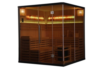 | Wyposażenie | • oświetlenie wewnętrzne z osobną wtyczką zasilania • piec i kamienie • ceber z chochlą na wodę do zraszania kamieni • higrometr (pomiar wilgotności) • klepsydra (do odmierzania czasu seansu w saunie) • dodatkowe oświetlenie LED RGB |