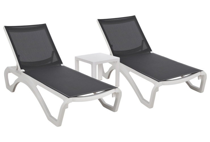 Leżak ogrodowy jest obowiązkowym wyposażeniem tarasu przydomowego, ale sprawdzi się również na większym balkonie. Stelaż wykonany został z polipropylenu w kolorze białym. Pokrycie z siatki textilene jest wytrzymałe i posiada właściwości pozwalające na użytkowanie leżaka na powietrzu: jest niepodatne na promieniowanie UV, nie wchłania wilgoci (po deszczu wystarczy przetrzeć materiał ściereczką, by go osuszyć), nie poddaje się działaniu kremów i olejków do opalania, nie ulega trwałym odkształceniom. Regulowane w 5 położeniach oparcie pozwala na wygodny relaks w każdej pozycji. W zestawie ze stolikiem możesz podzielić się relaksem z najbliższą osobą.